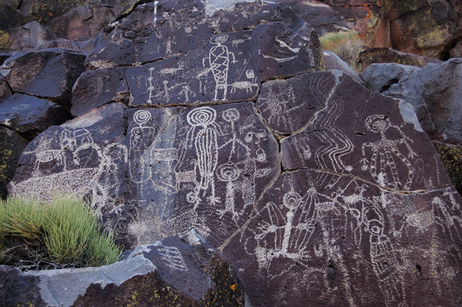 The N-P model uses clinical data to indicate that a rock art panel was inspired by a trance-like state although the subject matter across cultures may be different, the “formal characteristics of the arts should be similar.”[29] An example of art depicting all three of the N-P model symbols can be seen the petroglyph rock art of Coso Range in eastern California in Figure 3.
